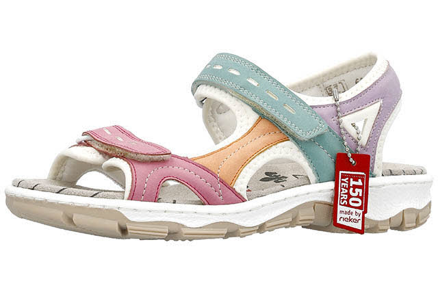 Ein Schuh - für jeden Spaß zu haben! Diese mehrfarbigen Trekkingsandalen aus Kunstleder von Rieker garantieren ein himmlisches Tragegefühl. Für bestmöglichen Halt sind die praktischen Sandalen mit einem breiten Fersenriemen und einem Klettverschluss ausgestattet. Die robuste und griffige Sohle sorgt für guten Halt. Darüber hinaus bietet die schmale Passform E 1/2 zusätzlichen Halt. Die perfekten Begleiter für alle Outdoor-Abenteuer!