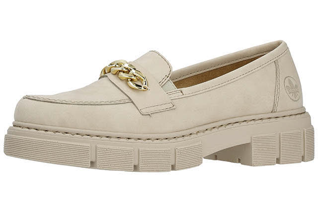 Edel und cool zugleich? Diese hellbeigen Rieker Loafer für Damen sehen nicht nur stylisch aus, sondern sorgen dank ihrer Qualität auch für den gewissen Komfort im Alltag. Der Elastikeinsatz erleichtert das An- und Ausziehen besonders. Die stilvolle Kette in Gold verleiht dem Schuh das gewisse Etwas. Die schockabsorbierende und leichte Sohle sorgt für ein angenehmes Laufgefühl auch bei langem Tragen und die extra weiche Decksohle sorgt für mehr Tragekomfort. Was will man mehr?