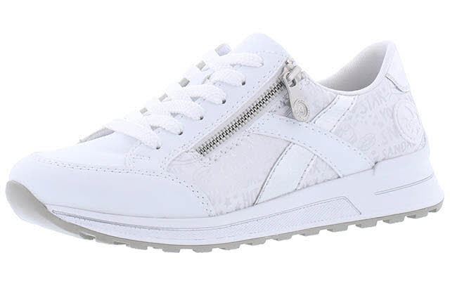 Style und Komfort - für immer unzertrennlich! Dieser reinweiße Rieker Sneaker für Damen überzeugt durch modernes Design und hohen Tragekomfort. Ein Reißverschluss ergänzt die Schnürung und sorgt für Funktionalität und Komfort. Mit der schockabsorbierenden und leichten Sohle freuen sich die Füße über besten Laufkomfort bei jedem Schritt. Die gepolsterte und herausnehmbare Einlegesohle ist ein cooles Feature, das für praktischen Komfort sorgt. Das Modell ist in Extraweite H geschnitten. Trageluxus pur!