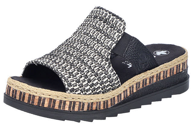 Sommer-Feeling pur! Diese schwarz/sandfarbene Rieker Pantolette für Damen möchte man gar nicht mehr ausziehen. Durch den seitliochen Elastikbänder kann der Schuh ganz schnell angezogen werden. Das modische Textmuster in schwarz/sand verleiht dem Schuh das gewisse Etwas und sorgt für viel Halt. Der offene Schuh sowie die schockabsorbierende und sehr leichte Sohle sorgen für anhaltendes Wohlgefühl. Ein weiteres Plus ist die extra weiche Decksohle. Extra-Halt ist durch die schmale Passform E 1/2 geboten. Trageluxus pur!