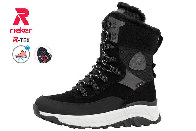 Diese Sport & Style Schnürstiefel für Damen in Black sind mit der wasser- und schmutzabweisenden HighTech Nano-Beschichtung und der atmungsaktiven RiekerTEX-Membran ausgestattet. Das innovative Glasfaser-Grip-Element in der Laufsohle sorgt für Extra-Halt auf Eis. Zusätzlich: Innensohle mit kälteblockendem Drei-Schichten-Aufbau für Thermo-Effekt, wertiges Textil, praktischer Zipper, superleichte EVA-Sohle und dämpfende, weiche Einlegesohle. Läuft bis Damen-Schuhgröße 43!